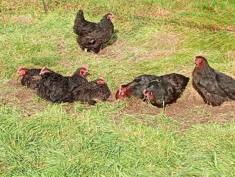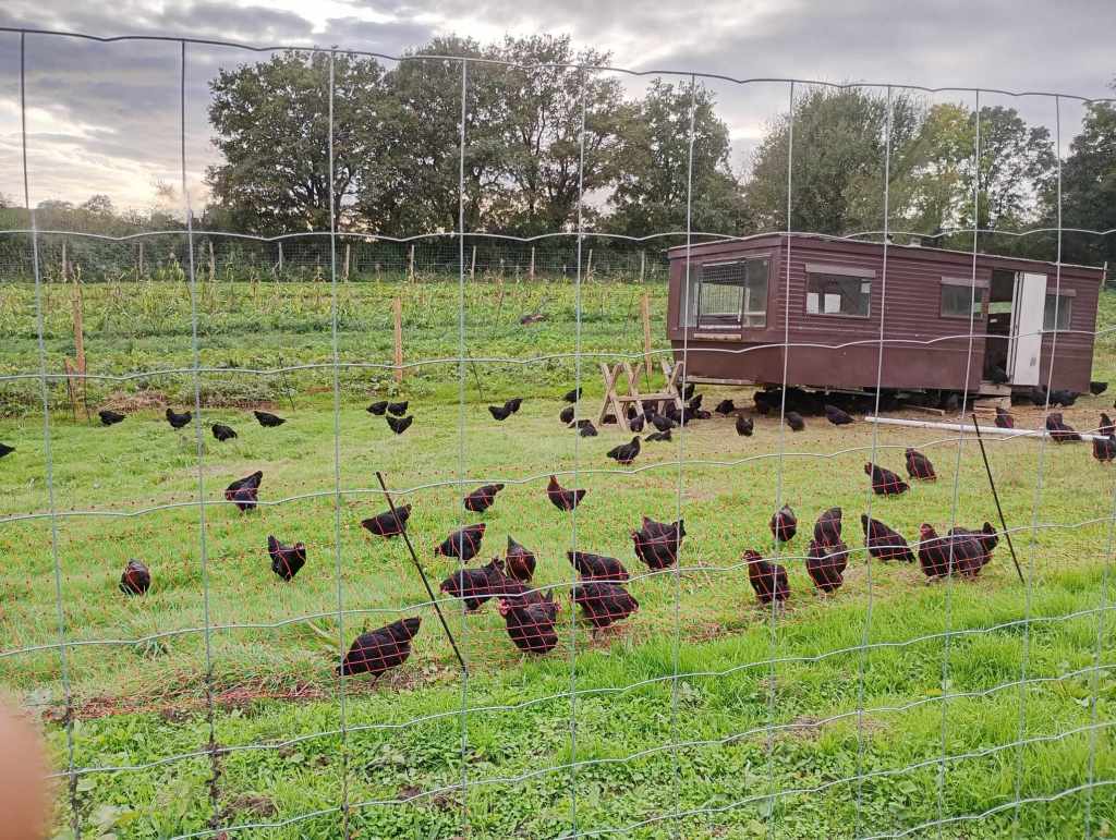 250 poules de race marans sont élevées à la ferme en plein air. Elles vivent en exterieur 100% du temps ( la nuit dans le poulailler mobile). Elles ont des parcours arborés (fruitiers) et ont toujours accès à l’herbe fraiche. En effet, le poulailler mobile crée sur la base d’un mobile-home permet de déplacer régulièrement les poules ( toutes les semaines) afin de bénéficier de leur fertilisation tout en évitant les surpâturages. L’aliment est certifié bio.